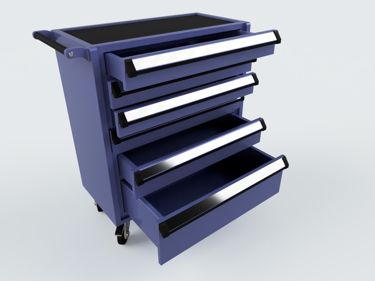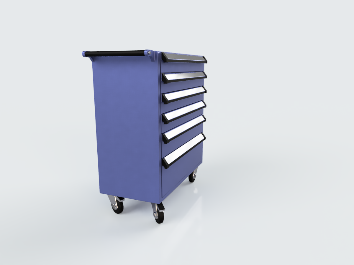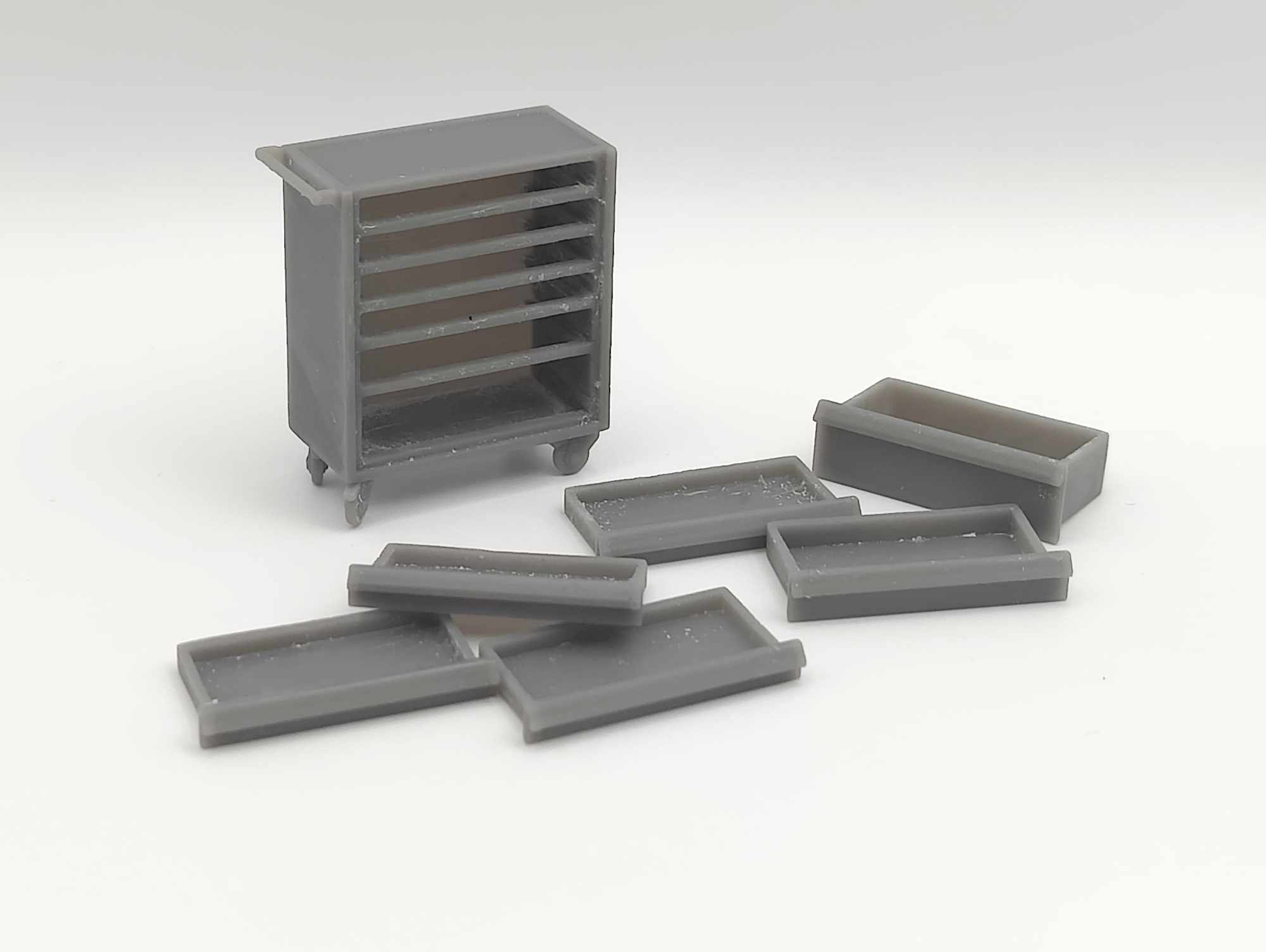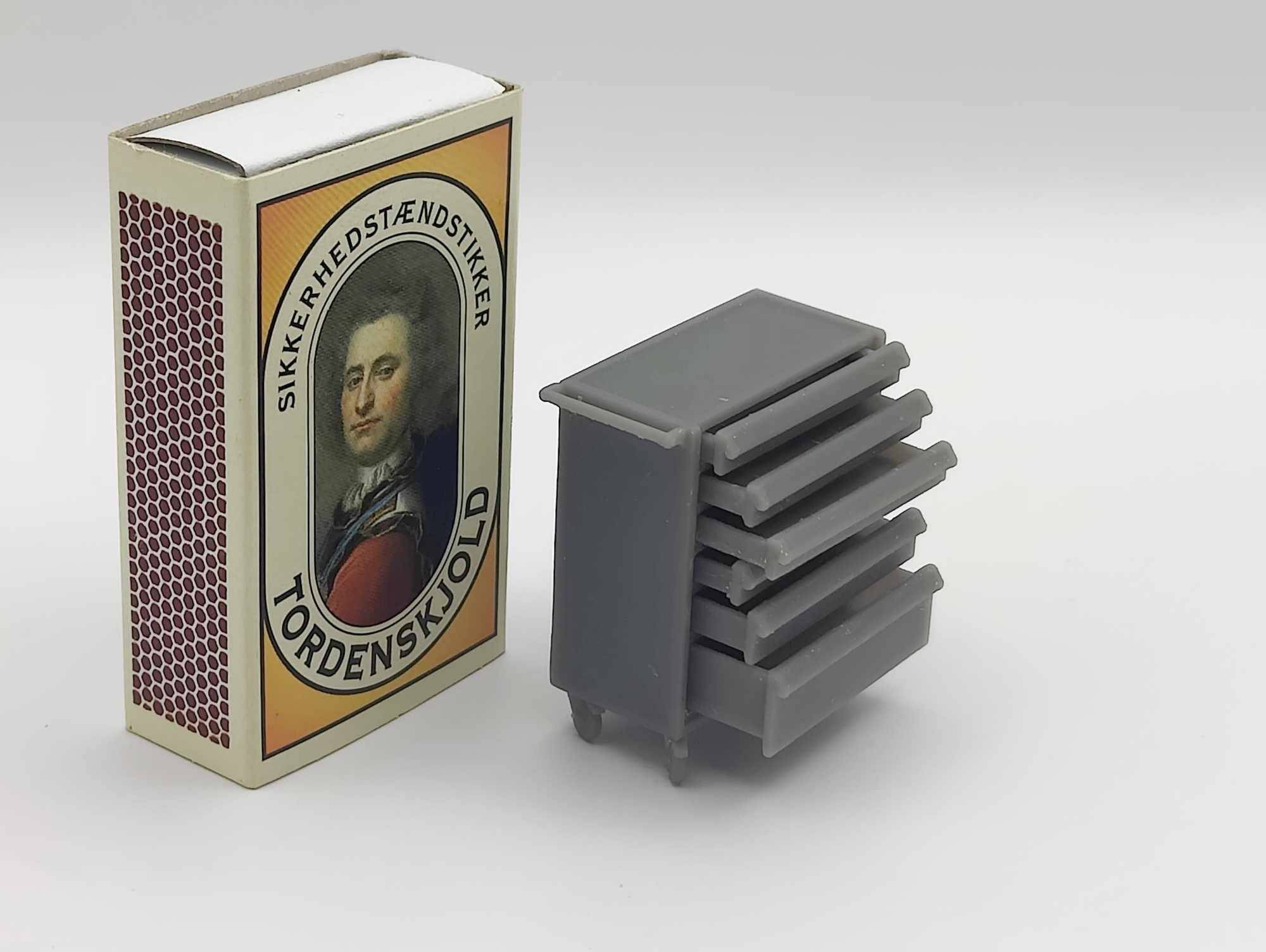 Detaljeret arbejdsbord i skala 1/24-25, perfekt til modelværksteder og dioramaer. Bordet står på 4 hjul og har 6 skuffer: 4 små øverst, en mellemstørrelse og en stor nederst. Ideel til at tilføje realisme til dine modeller.
