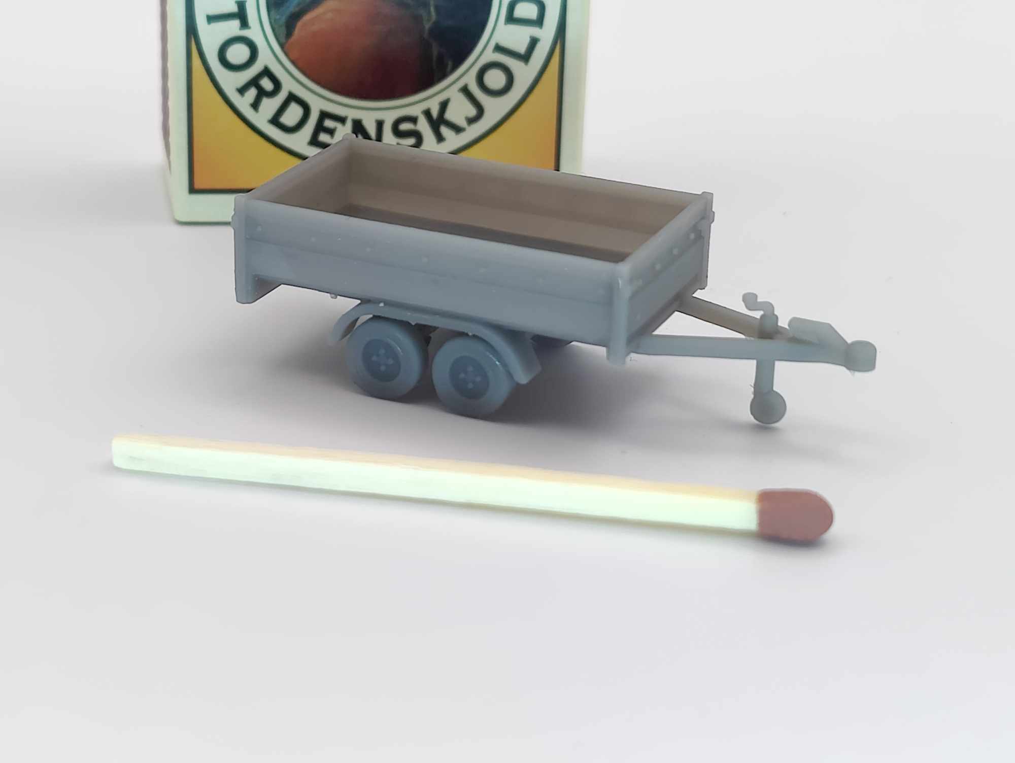 Denne detaljerede boogietrailer i skala 1/87 (Spor H0) er en realistisk model af en trailer med to aksler. Med en længde på 46 mm, inklusiv træk, gengiver den præcist de karakteristiske elementer fra en rigtig trailer. Modellen er udstyret med surreknopper til fastspænding af last, hægtebeslag samt en nummerpladeholder, hvilket giver et autentisk udtryk. Perfekt til dioramaer, modelbaneanlæg eller som en del af en realistisk miniaturetransportscene.