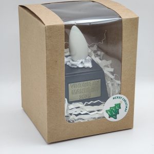 Denne mandelgave-pokal 2025 er helt unik: På den mørkebrune sokkel står der “Vinder af mandlen 2025”, og på toppen ses en flot portion hvid risalamande med små kantede mandelstykker, kronet af den cremefarvede mandel, der stolt rager op.